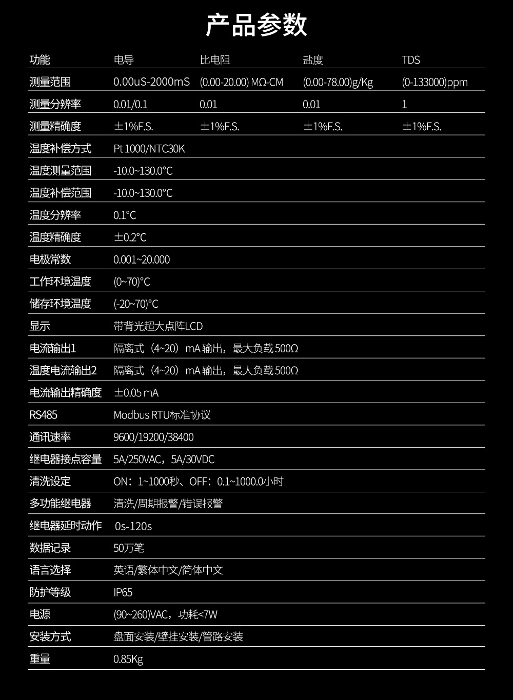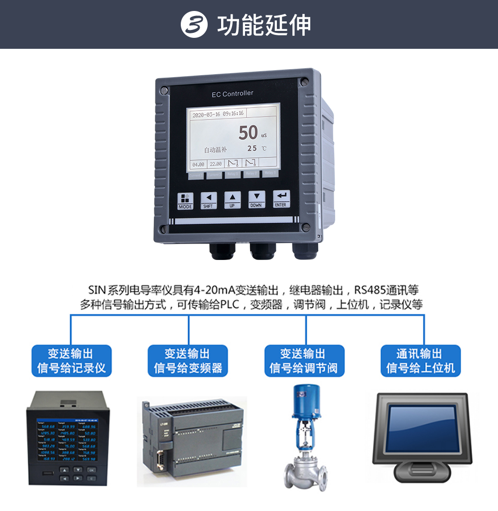 聯(lián)測(cè)儀表SIN-EC8.0用于工業(yè)上電導(dǎo)/比電阻/鹽度/溶解固體總量及溫度的測(cè)量,如: 廢水,純凈水,環(huán)境監(jiān)測(cè),食品生產(chǎn)過(guò)程等,儀器可以盤面安 裝,壁掛安裝,管路安裝。儀器提供 2 路電流輸出,最大負(fù)載為 500Ω, 儀器提供 3 路控制用繼電器,繼電器最大承受電壓及電流為 5A/250VAC 或 5A/30VDC。