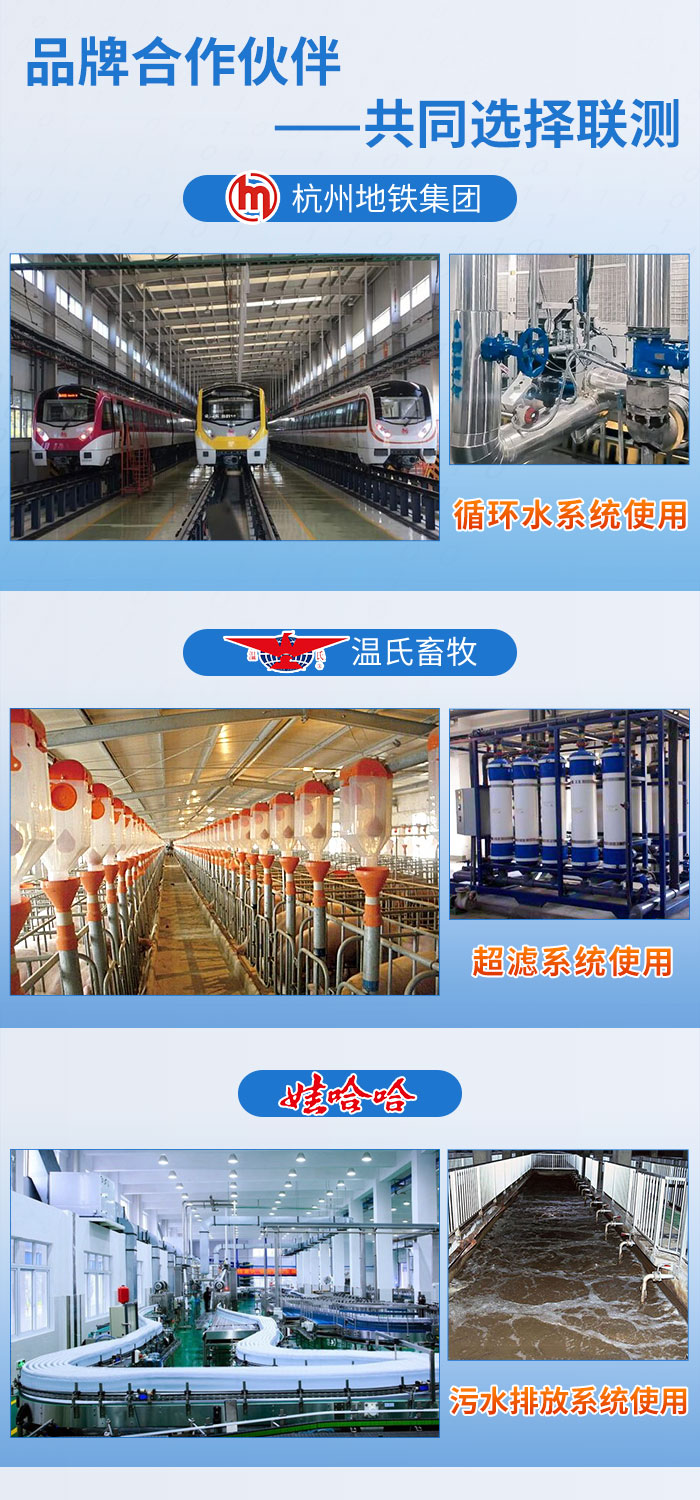 近年來(lái),聯(lián)測(cè)儀表廣泛應(yīng)用于各大領(lǐng)域,與國(guó)內(nèi)品牌杭州地鐵集團(tuán)、溫氏畜牧、娃哈哈......達(dá)成合作,專(zhuān)業(yè)的技術(shù),敬業(yè)的服務(wù)贏(yíng)得了諸多企業(yè)的信賴(lài)與支持。本次合作也給客戶(hù)留下了良好的印象,好評(píng)連連,溫州繞城高速公路有限公司表示,后續(xù)多個(gè)站點(diǎn)會(huì)批量使用我司電磁流量計(jì)。